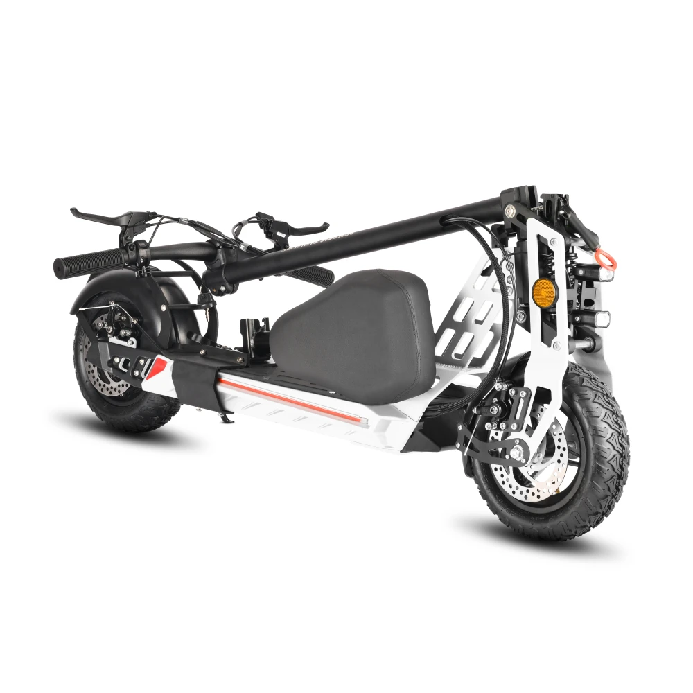 Электродвигатель мощностью 1000 Вт свободно разгоняется до максимальных показателей 45 км/час. Литий-ионный аккумулятор (емкостью 16000 мАч) надежно защищен от механических повреждений. Полного заряда АКБ (8 часов) хватит на прохождение 50 км пути. Амортизационные пружины хорошо смягчают дорожные неровности и дарят полное ощущение комфорта. Складная конструкция и удобное сидение делают его особенно популярным среди райдеров. Резиновые надувные колеса (11 дюймов) рассчитаны на эксплуатацию в городской местности и парковых зонах. Широкая дека 22*47 см позволит пользователю комфортно располагаться при поездках. Дисковая механическая тормозная система предусмотрена отдельно на каждом колесе дарит райдеру полное ощущение безопасности. Для большего удобства поездок на руле расположен переключатель скоростей.