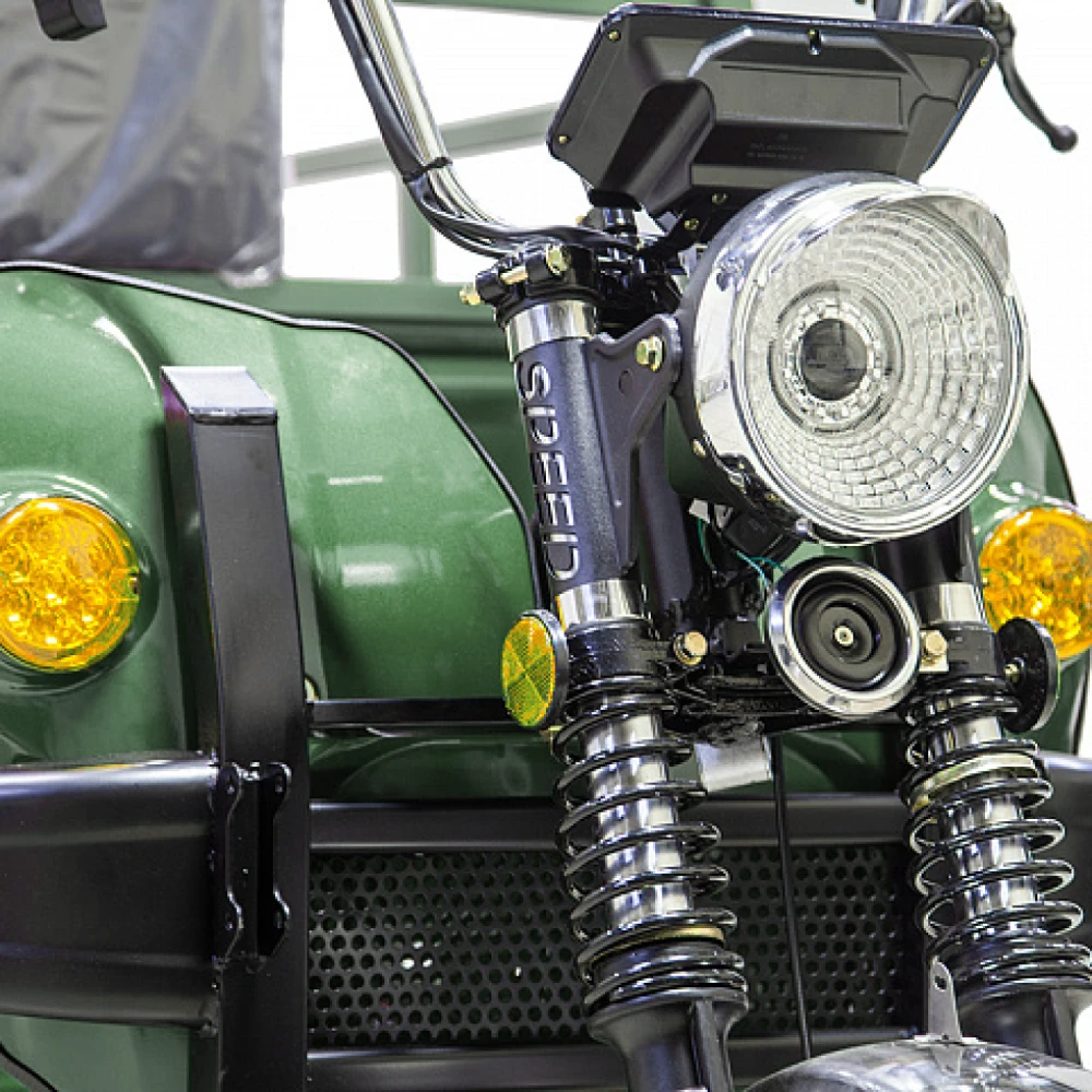 Всесезонная техника оснащена зеркалом заднего вида, мощной светодиодной фарой, удобным комфортным сиденьем. С такими характеристиками управлять электротрициклом удобно.
