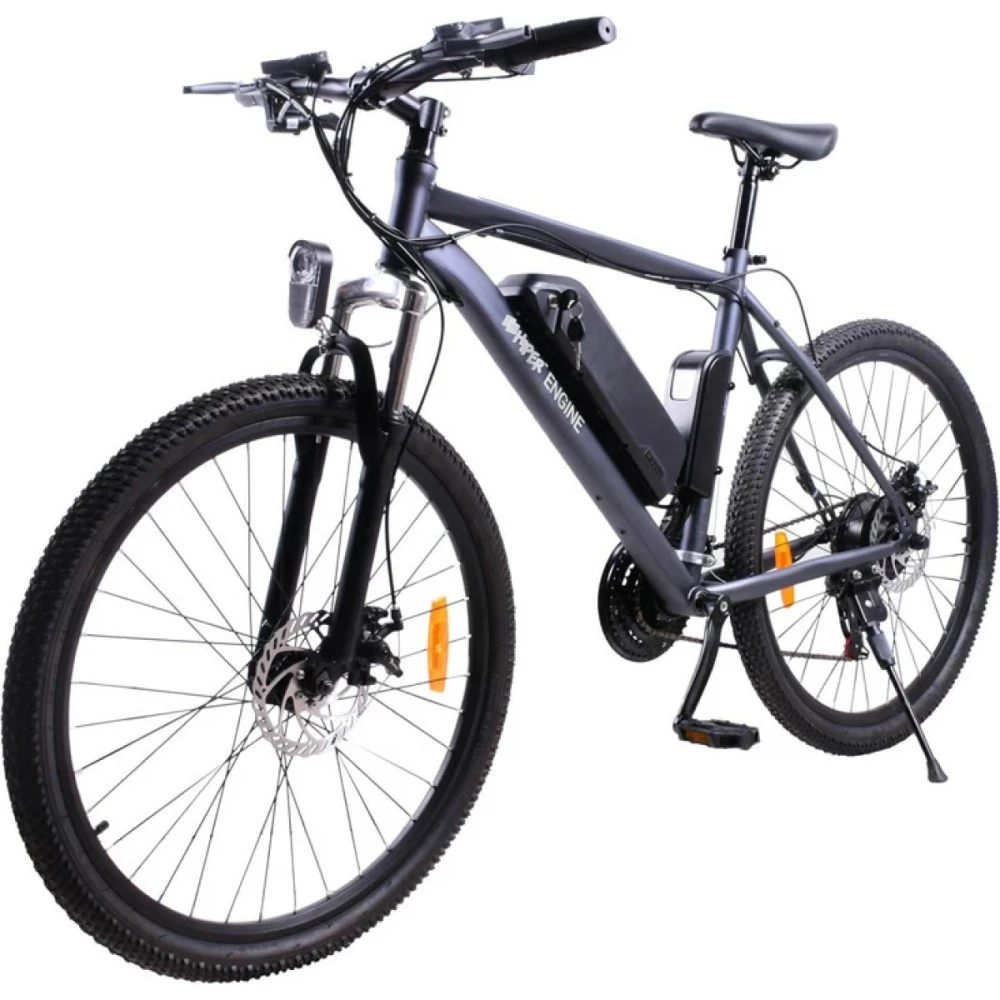 Электровелосипед HIPER Engine B51 серый визуально напоминает туристический байк,  рассчитанный для езды по бездорожью. Предположения полностью оправдываются техническими характеристиками. Гибрид грузоподъемностью 130 кг с трансмиссией 21 скорость настоящая находка для активных байкеров и путешественников. Также модель доказала целесообразность покупки при езде в черте города.